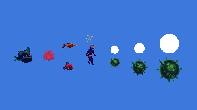 Tags | 16-bit, 2D, Arcade, diver, Dungeon Crawler, fish, Pixel Art, Retro, Singleplayer, underwater |